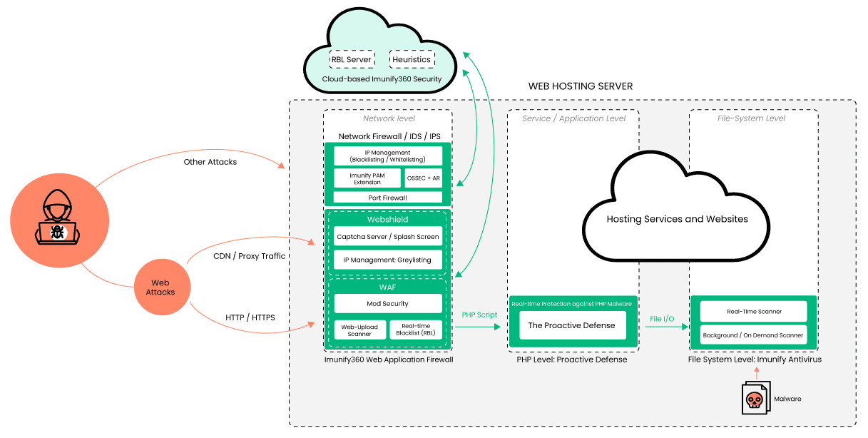 - Imunify360 combines multiple security components into one engine for better protection and data sharing.